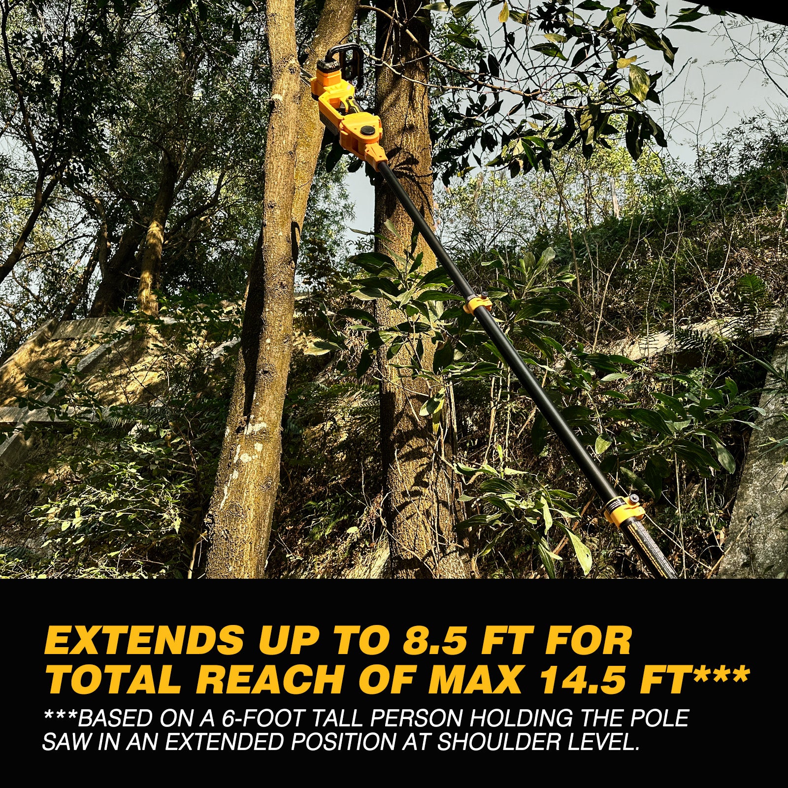 Adjustable 180° Telescopic Pole: The 180° rotatable head provides excellent cutting flexibility, and the extension pole can be extended from 5.7 to 8.5 feet and up to 14.5 feet (based on a 6-foot tall person extending the pole saw to shoulder level). Trimming branches in different locations is easy and effortless without having to rely on unstable ladders.