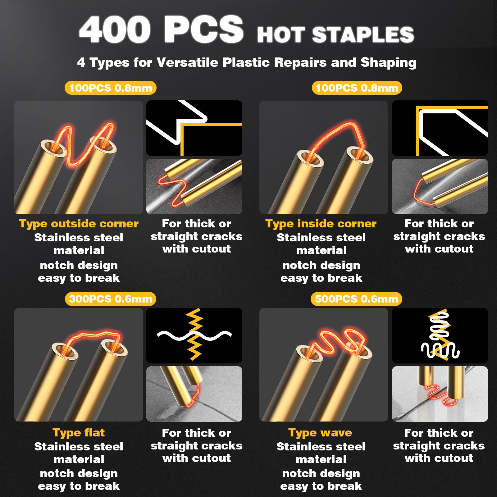 - Multi-functional Repair Tool: Effortlessly repairs a wide variety of plastic products, such as car bumpers, dashboards, lamp sockets, plastic rings, radiators, and outdoor sports equipment repairs (including canoes, kayaks, etc.). It is suitable for items made from materials like ABS, PP, TPO, TPE, and more, enabling worry-free DIY repairs.